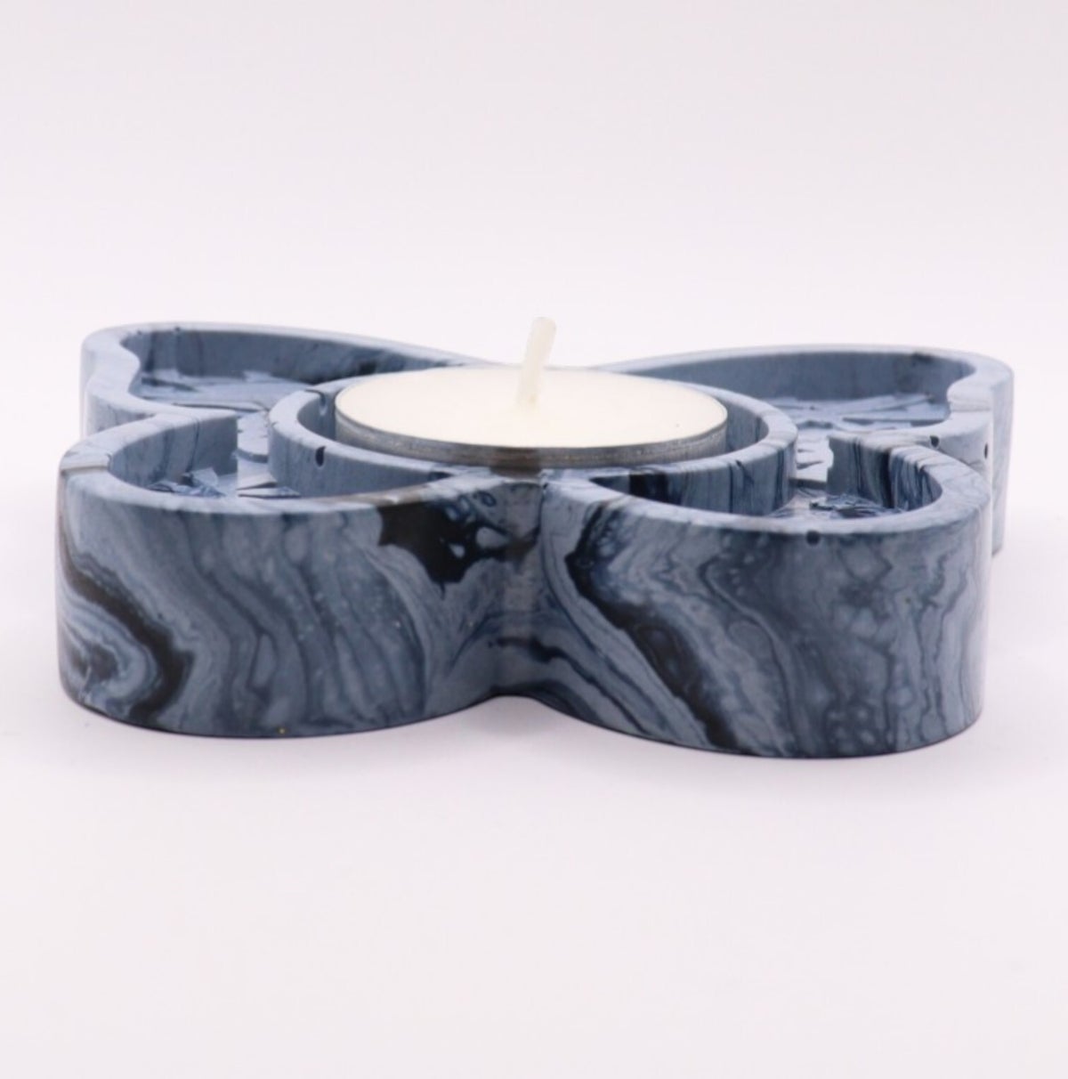 Butterfly Blues brengt een serene rust in de collectie. Dit model is uitgevoerd in een diepe, blauwe tint die doet denken aan de schemering. Door de Jesmonite zijn subtiele kleurnuances verweven die het licht van een waxinelichtje prachtig vangen.